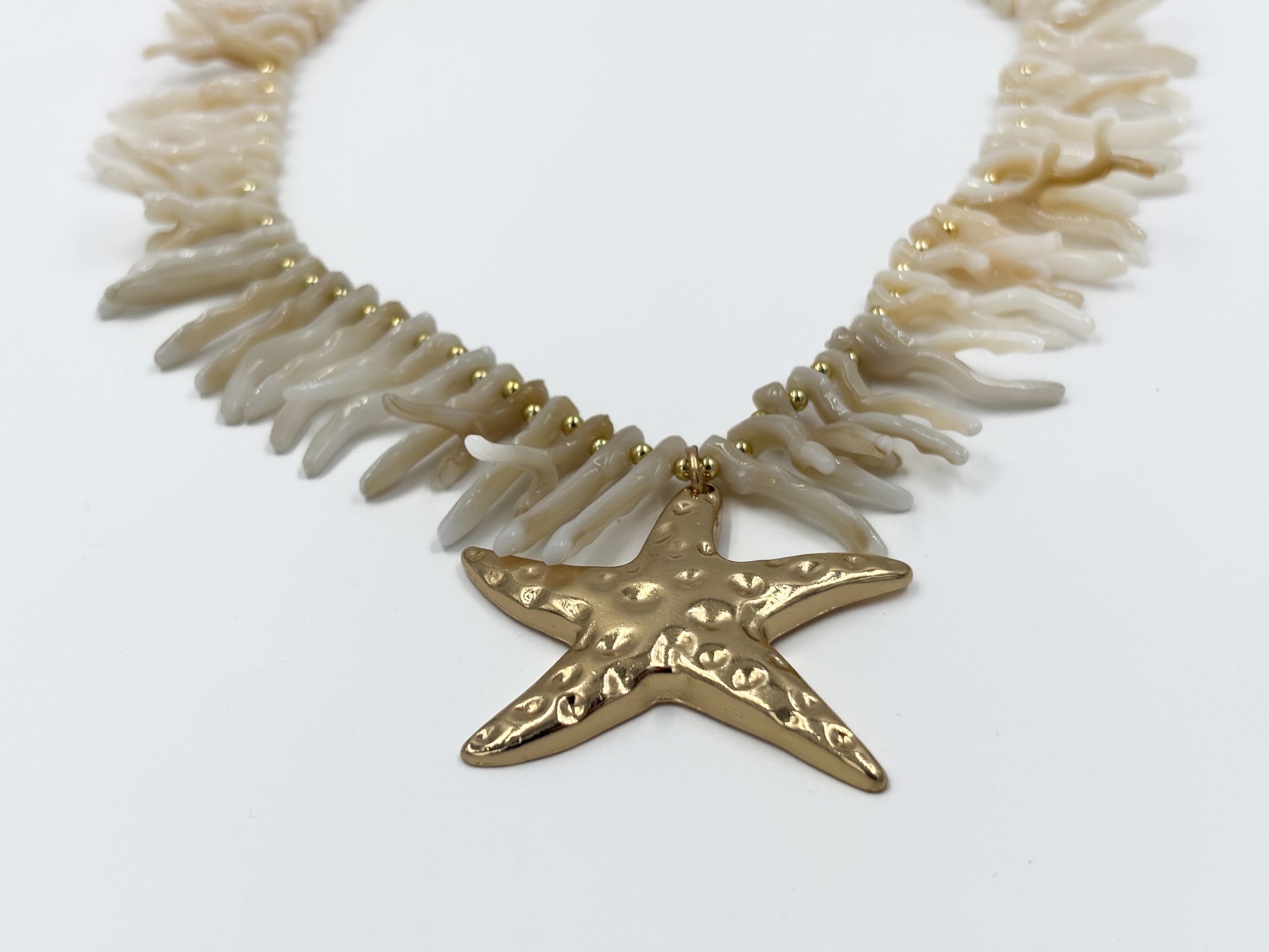 No es un accesorio, es una declaración. El collar Arenas combina formas orgánicas y tonos marfil con una estrella dorada central que roba el protagonismo. Tiene textura, presencia y carácter. Perfecto para quienes no temen destacar con piezas que parecen salidas de otra orilla.