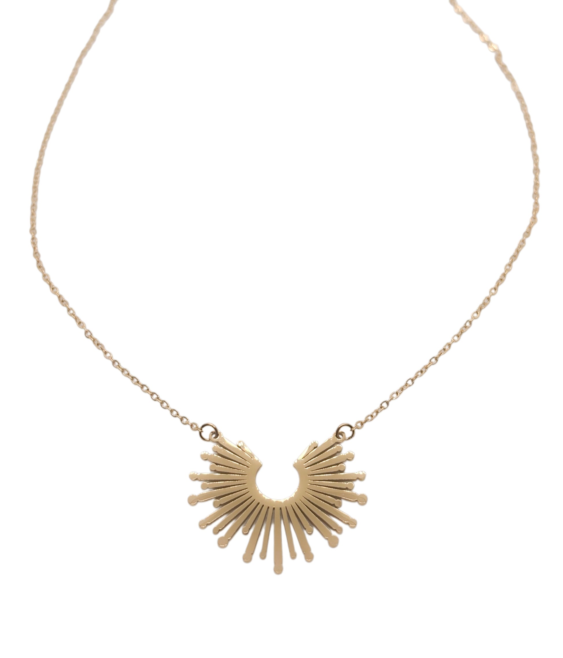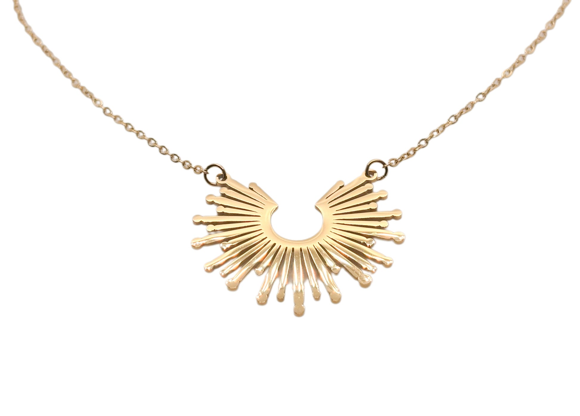 Un diseño inspirado en ese instante mágico en que el sol toca el mar. Con un medio sol de acero inoxidable en tonos dorado y plateado, esta pieza captura la calidez y el brillo del atardecer sobre el océano. Resistente al agua y al paso del tiempo, como tus momentos favoritos.